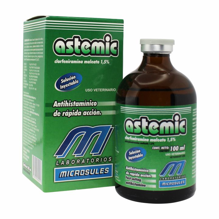 Astemic is a fast-acting antihistamine, H1 receptor antagonist. It is indicated to block or counteract the effects of an excessive release of histamine in the body, as a response to allergic and/or anaphylactic reactions; allergies, swellings, eczema, photosensitisation, acute laminitis, tympanism and ruminal atony, post-delivery mammary oedema and infectious processes in general. It is also recommended for insect or snake bites; reactions to vaccination (better results are obtained in this case if product is administered prior to vaccination); blood transfusions; to alleviate itches and skin allergies, etc.