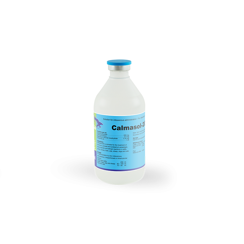 Calmasol-204 is a well-balanced solution for the treatment of acute hypocalcaemic conditions in cattle, calves horses, foals sheep, pigs, dogs and cats. Hypocalcaemia frequently occurs in these animals and is often accompanied by metabolic disorders. The decisive advantage of calcium gluconate is its excellent tissue-tolerance. The animal’s heart is protected against the cardiotoxic effects of calcium during intravenous application by the addition of magnesium.