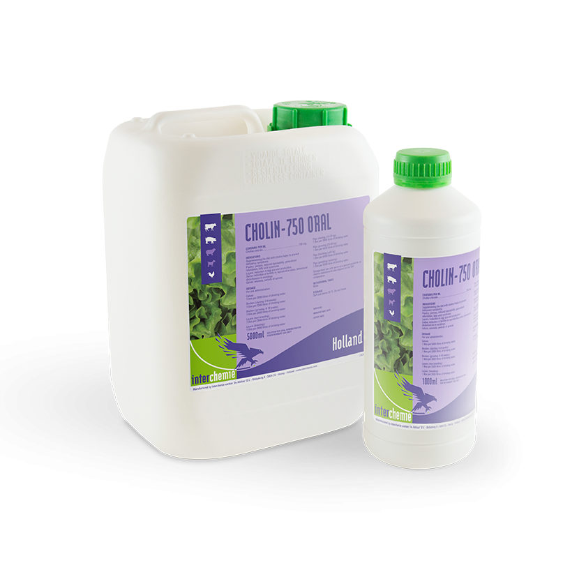 The bioavailability of choline in raw materials used in animal feed is variable. Therefore, supplementation with Cholin-750 Oral helps to provide adequate levels of choline in the diet. Deficiency problems, like perosis in poultry, might be avoided when using Cholin-750 Oral.