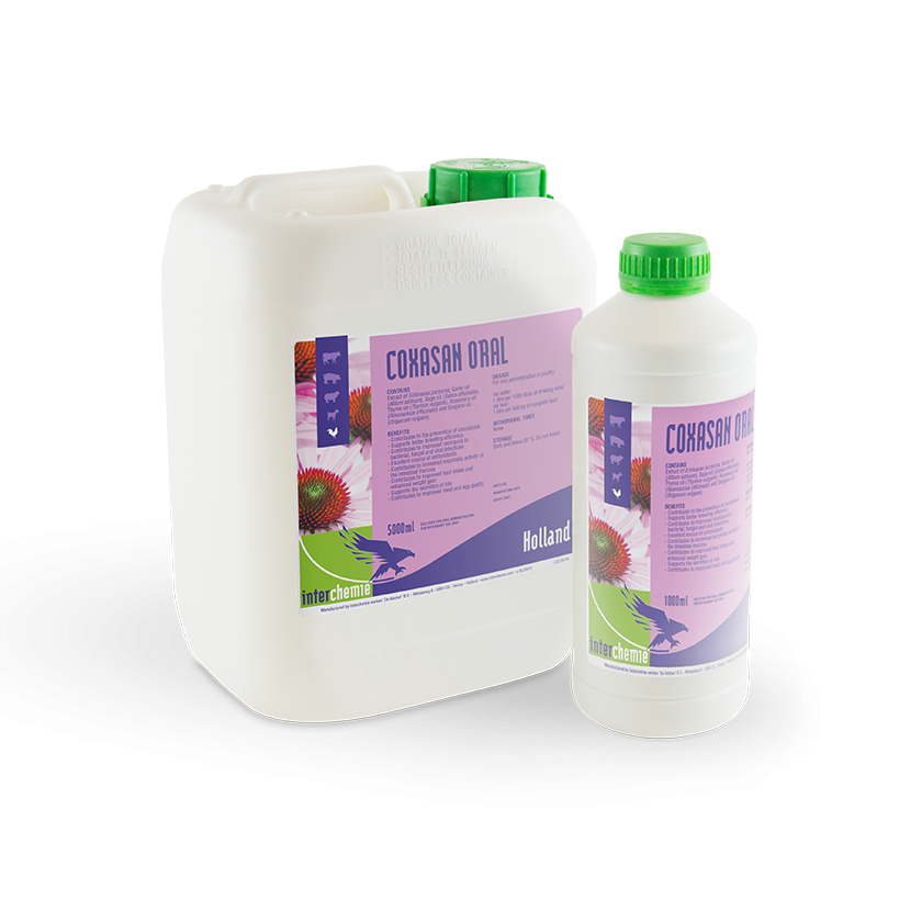 Coxasan Oral is a unique carefully selected composition of natural plant extracts for the prevention of coccidiosis for all species and groups of poultry. Furthermore, Coxasan Oral also has bacteriostatic and immunostimulant properties. This product helps in the solution to the problem of growing resistance of protozoa to coccidiostats.
