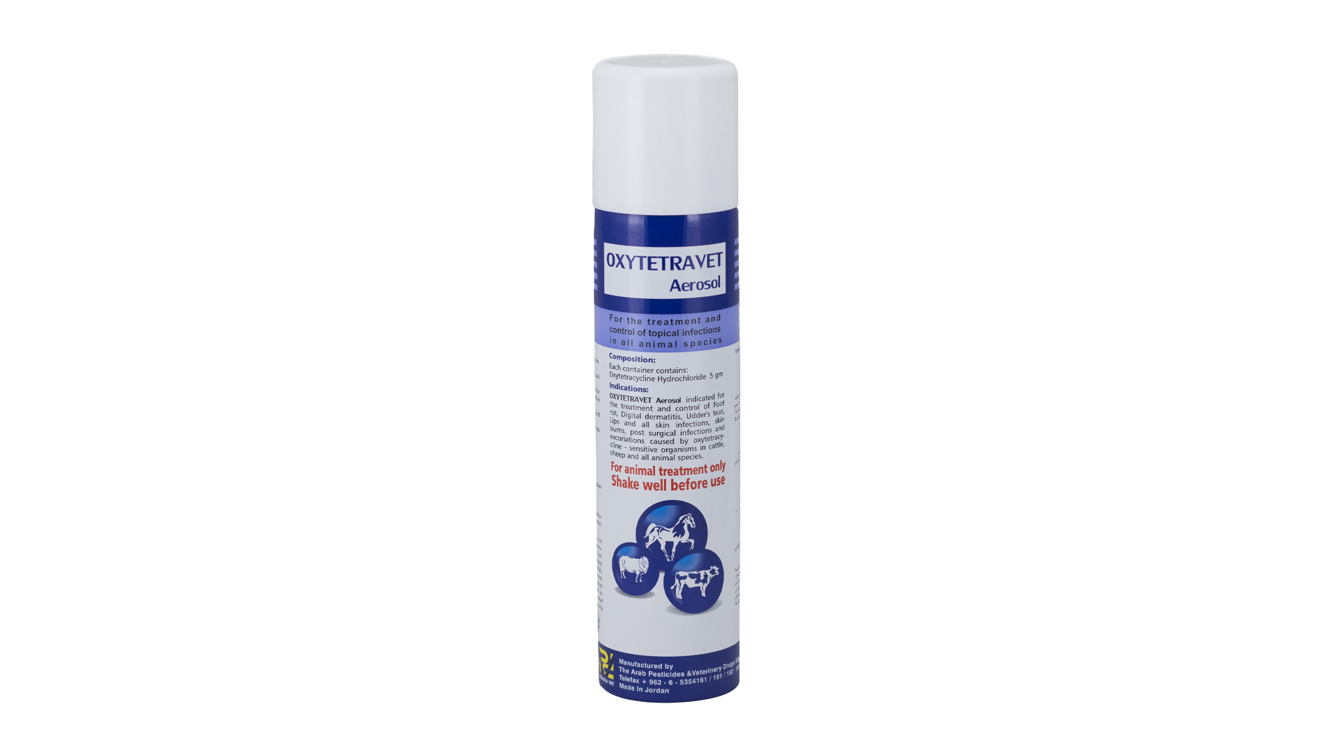 OXYTETRAVET Aerosol indicated for the treatment and control of Foot rot, Digital dermatitis, Udder’s teat, Lips and all skin infections, skin burns, post surgical infections and excoriations caused by oxytetracycline – sensitive organisms in cattle, sheep and all animal species.